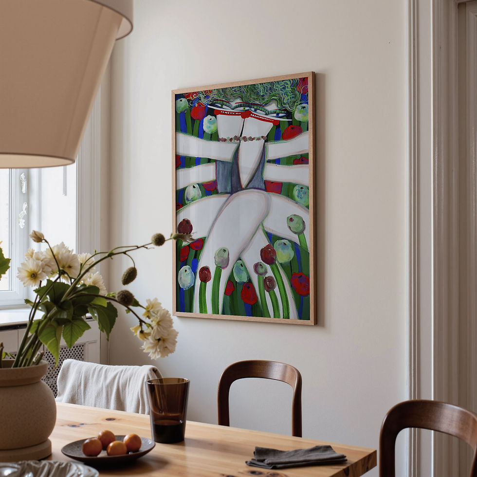A striking contemporary surrealist painting featuring intertwined female figures emerging from a vibrant field of abstract flowers. Bold colours, expressive faces, and dynamic elongated limbs create a playful yet emotional composition. The artwork blends femininity, humour, and surreal forms, making it a standout piece for collectors of modern figurative art and expressive surrealism. An eye-catching original ideal for adding colour, character, and contemporary style to any collection or interior.