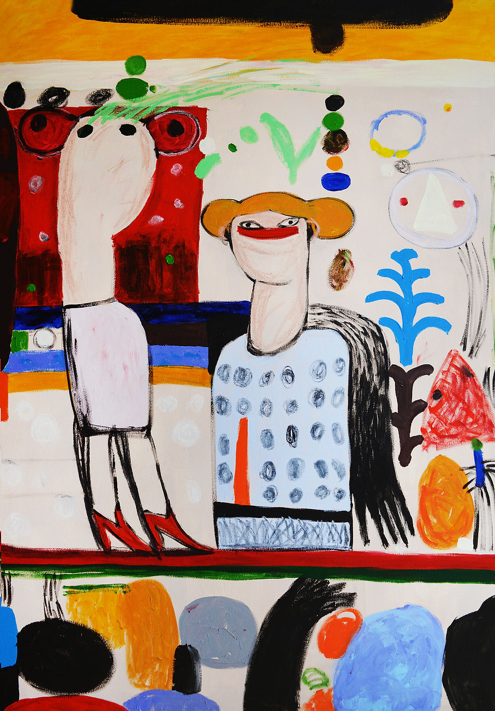 This contemporary painting blends figurative art with abstraction, making it a striking piece for collectors interested in modern, expressive, and narrative-driven works. Ideal for contemporary interiors, gallery spaces, or curated art collections, it brings a sense of whimsy, character, and artistic individuality to any environment.
