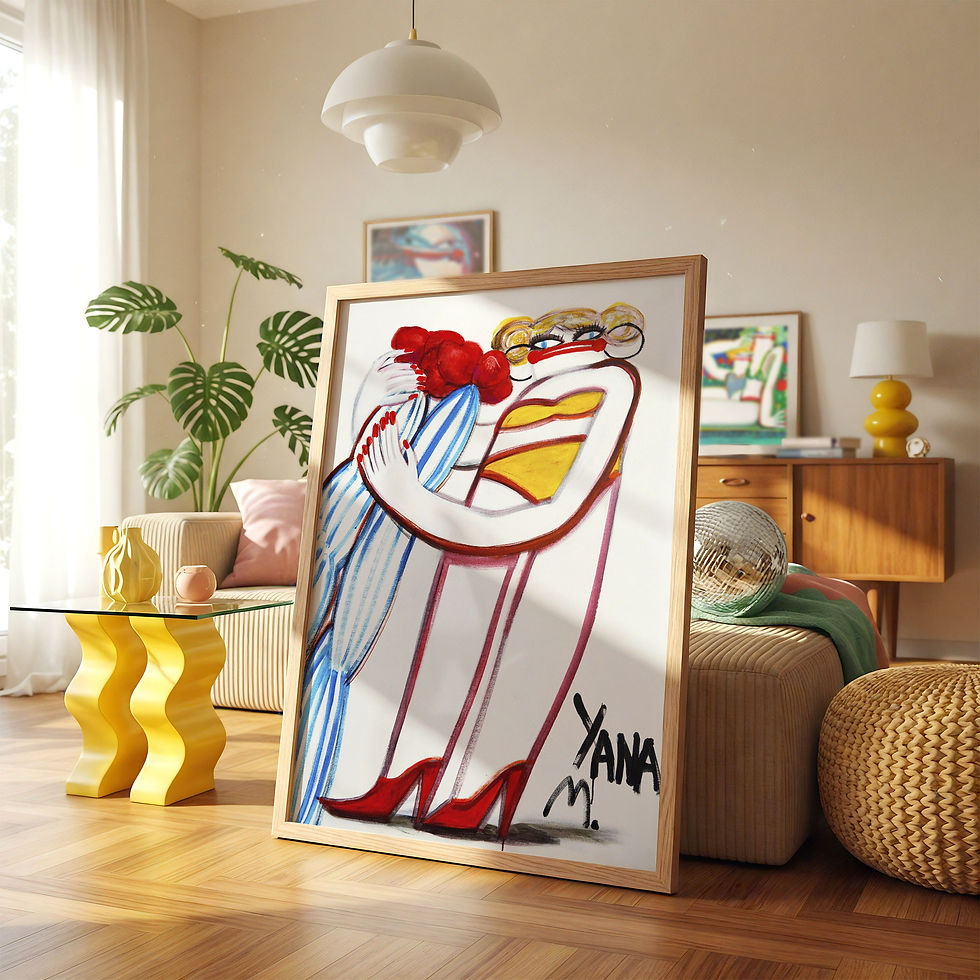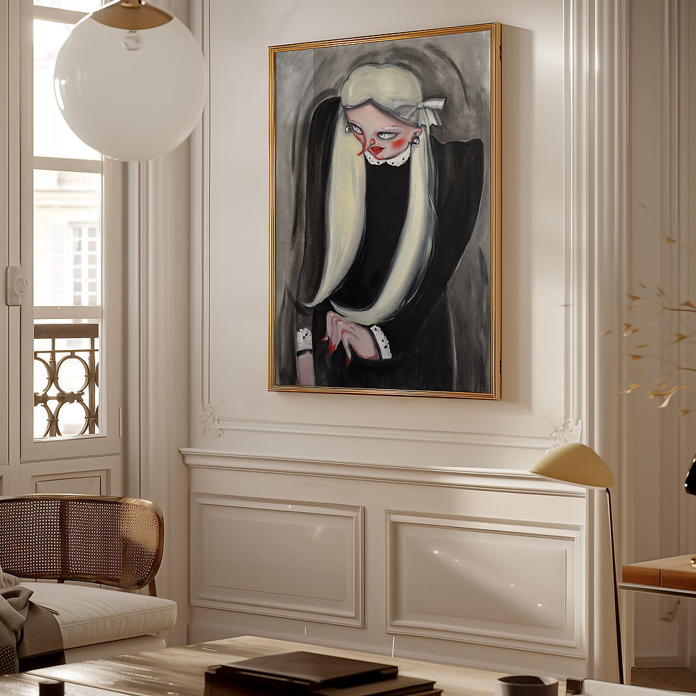 Experience the chilling elegance of this unique original mixed-media painting. Featuring a stylized woman draped in an oversized dalmatian-print faux fur coat and matching winter hat, this piece captures a moment of intense, cinematic suspense.